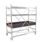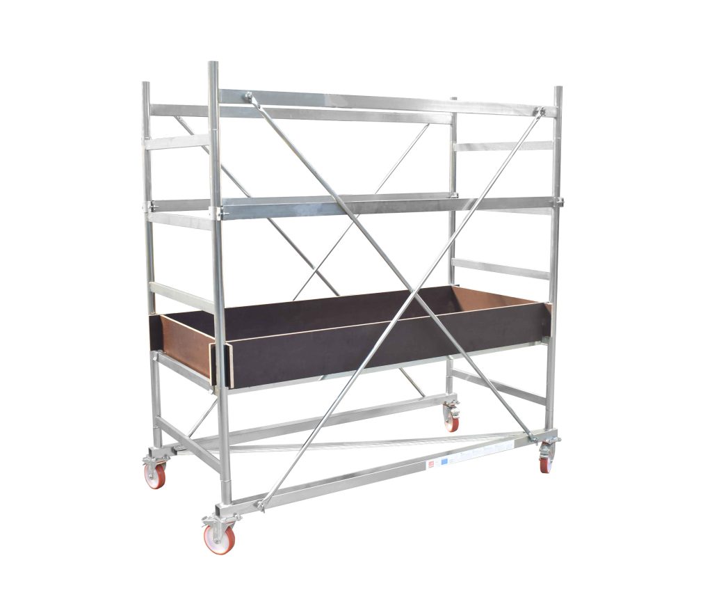Plancher de travail (0,70x1,6 m) en deux pièces, avec trappe, en Eurodeck FSC antidérapant. Garde-pieds anti-chute sur les quatre côtés.